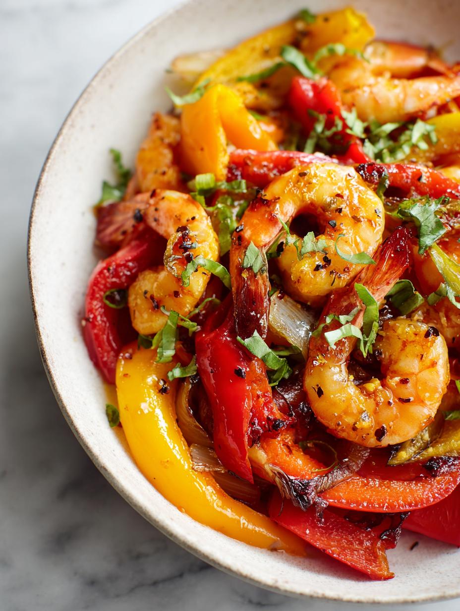 This vibrant dish features colorful peppers that blister and char quickly, releasing smoky sweetness that complements tender, juicy shrimp. The process involves high-heat searing and quick sautéing, resulting in a visually appealing, flavorful plate with smoky, sweet, and tangy notes. The final dish is bright, slightly charred, and bursting with fresh flavors, perfect for a quick weeknight dinner.