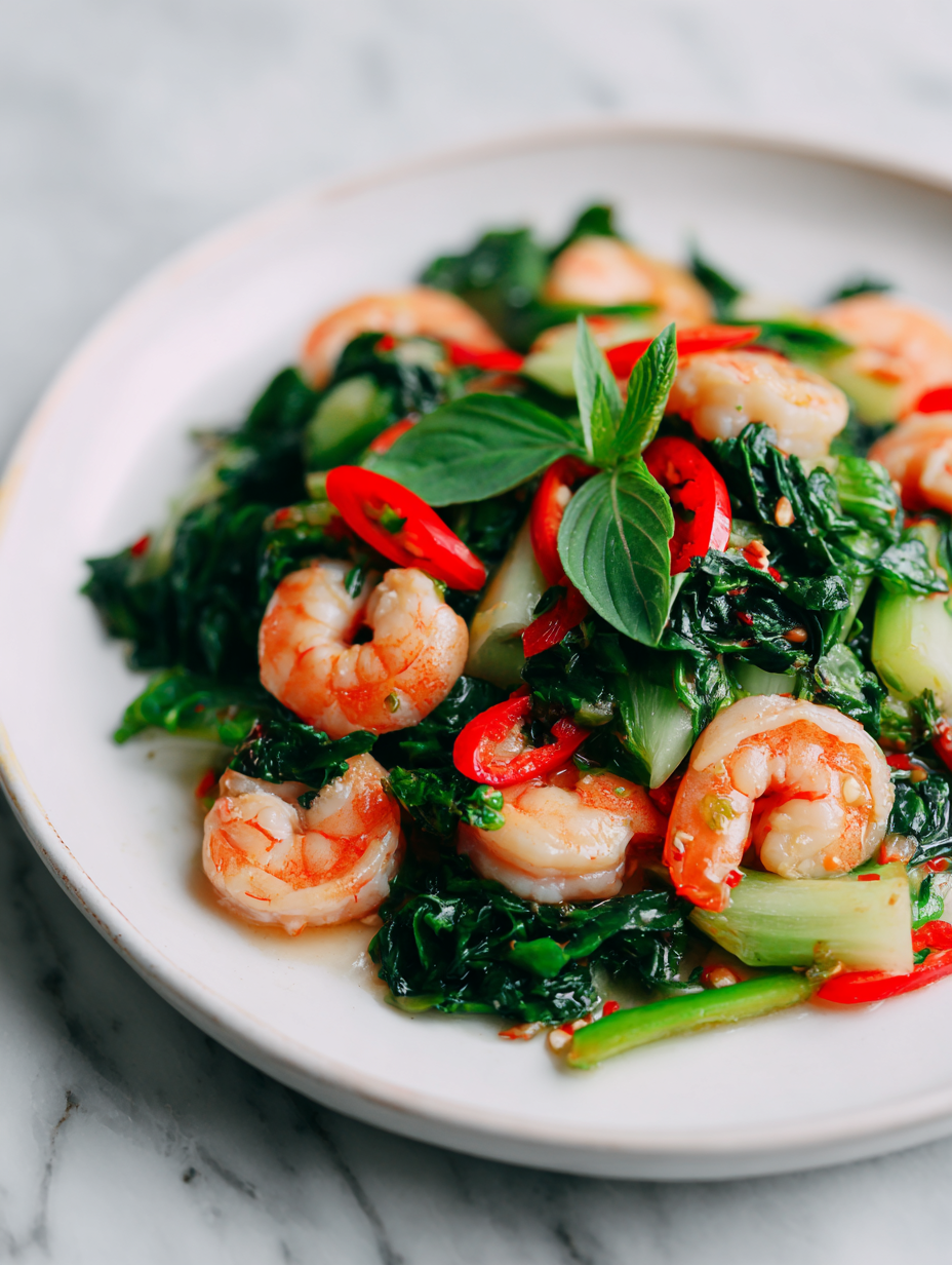 This vibrant stir-fry features juicy shrimp cooked quickly with garlic and chili, finished with fragrant Thai basil added at the last moment to lock in its bright aroma. The dish boasts tender shrimp with a caramelized edge and fresh, wilted basil leaves, creating a lively, summery flavor profile. It’s a simple, fast recipe that captures the essence of Thai street food in every bite.